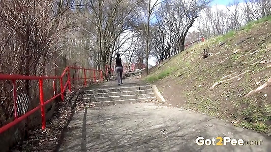 une sale femelle aux cheveux de corbeau trouve uriner dans les escaliers