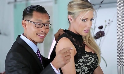 Dirty blonde bitch finds a warm connection with her Asian husband's boss.